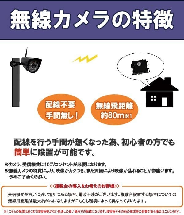 複数台設置の場合、電波干渉の恐れがある為カメラとレシーバ-との距離が10m以内の場所への設置を推奨しております。